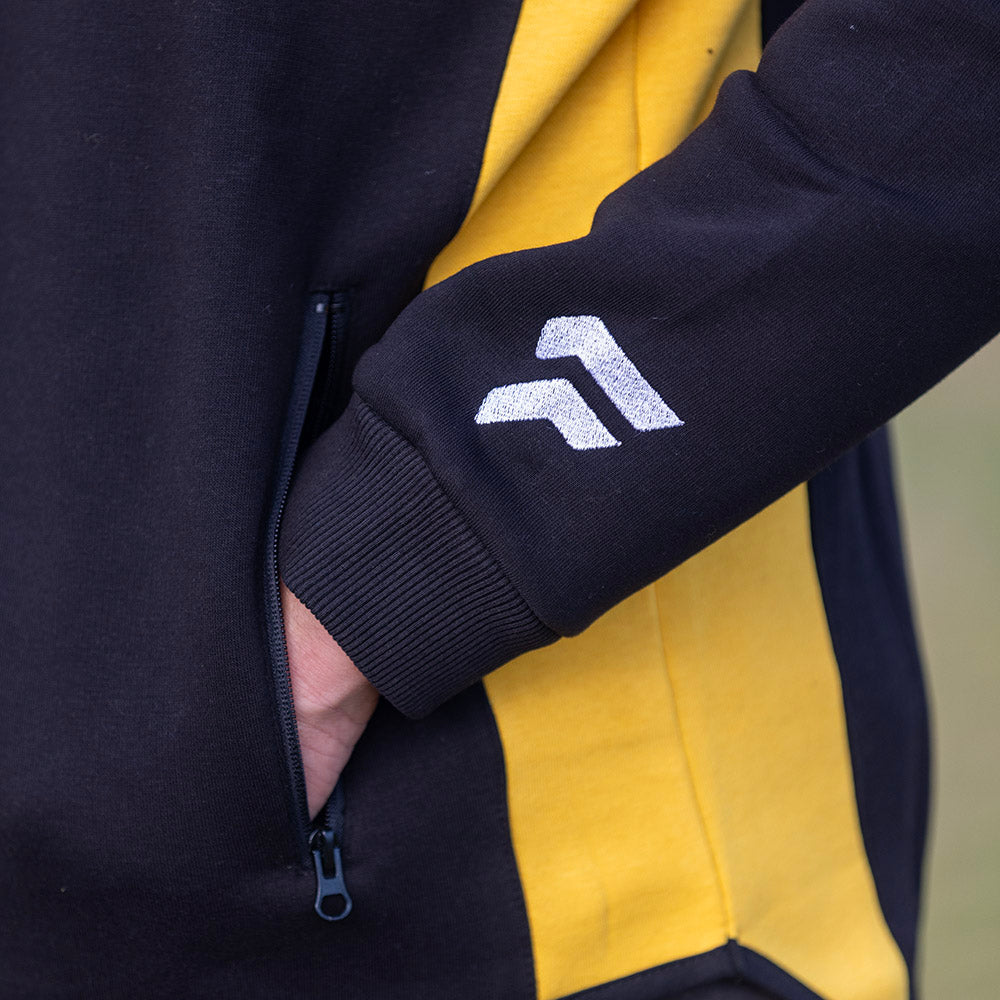 FED by Farmers adult shearing hoodie in Black and Yellow.