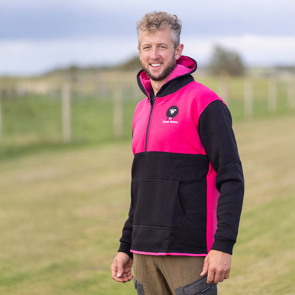 These are our new Shearing hoodies with pink back, chest, trim and hood lining..... the rest is black.